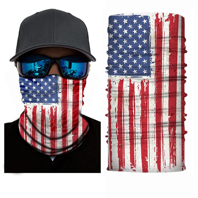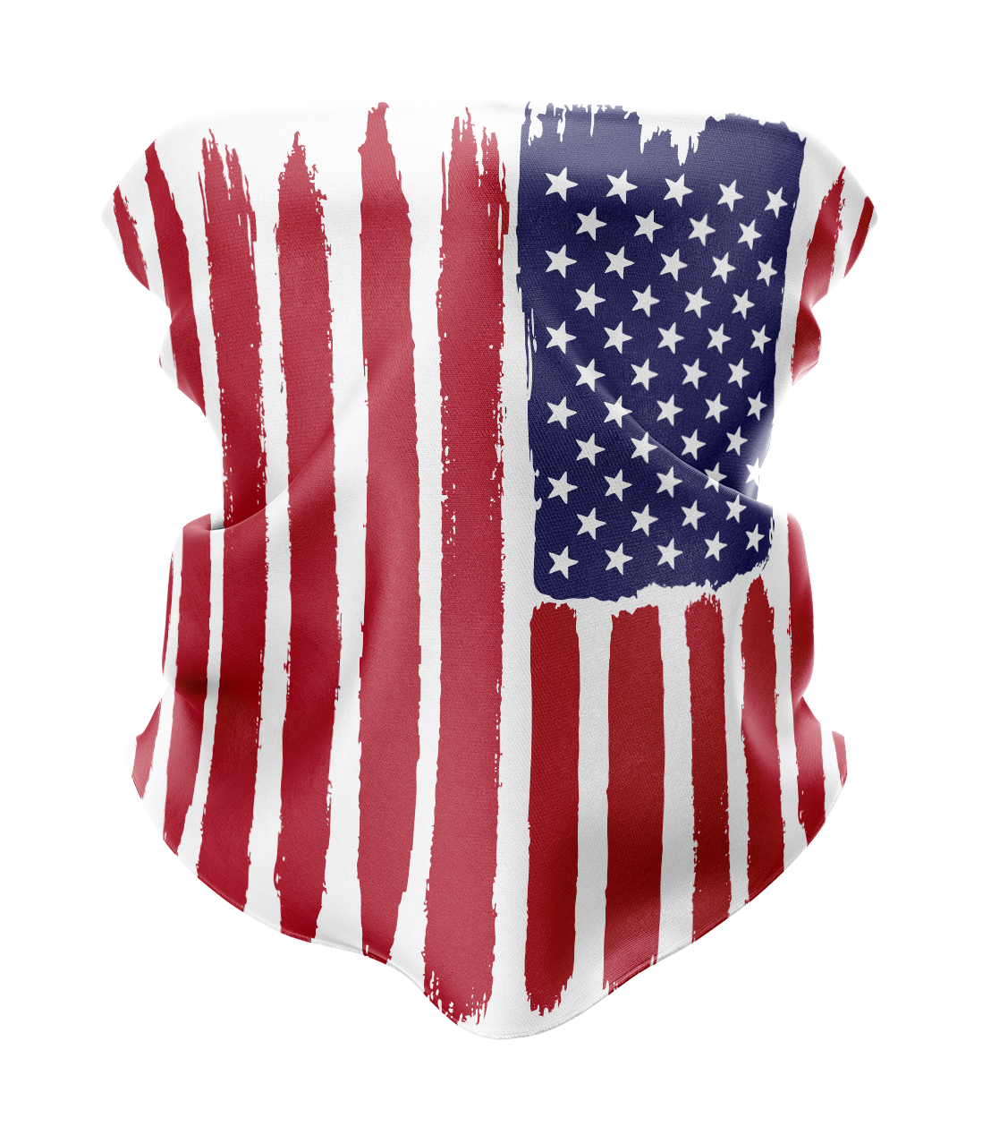 US Flag Print Face + Neck Gaiter: providing comfortable protection from the elements from sun to wind, dust, and insects. Can be worn multiple ways: as a face covering, neck gaiter, or headband. Made from durable stretch fabric printed with the Stars + Stripes.